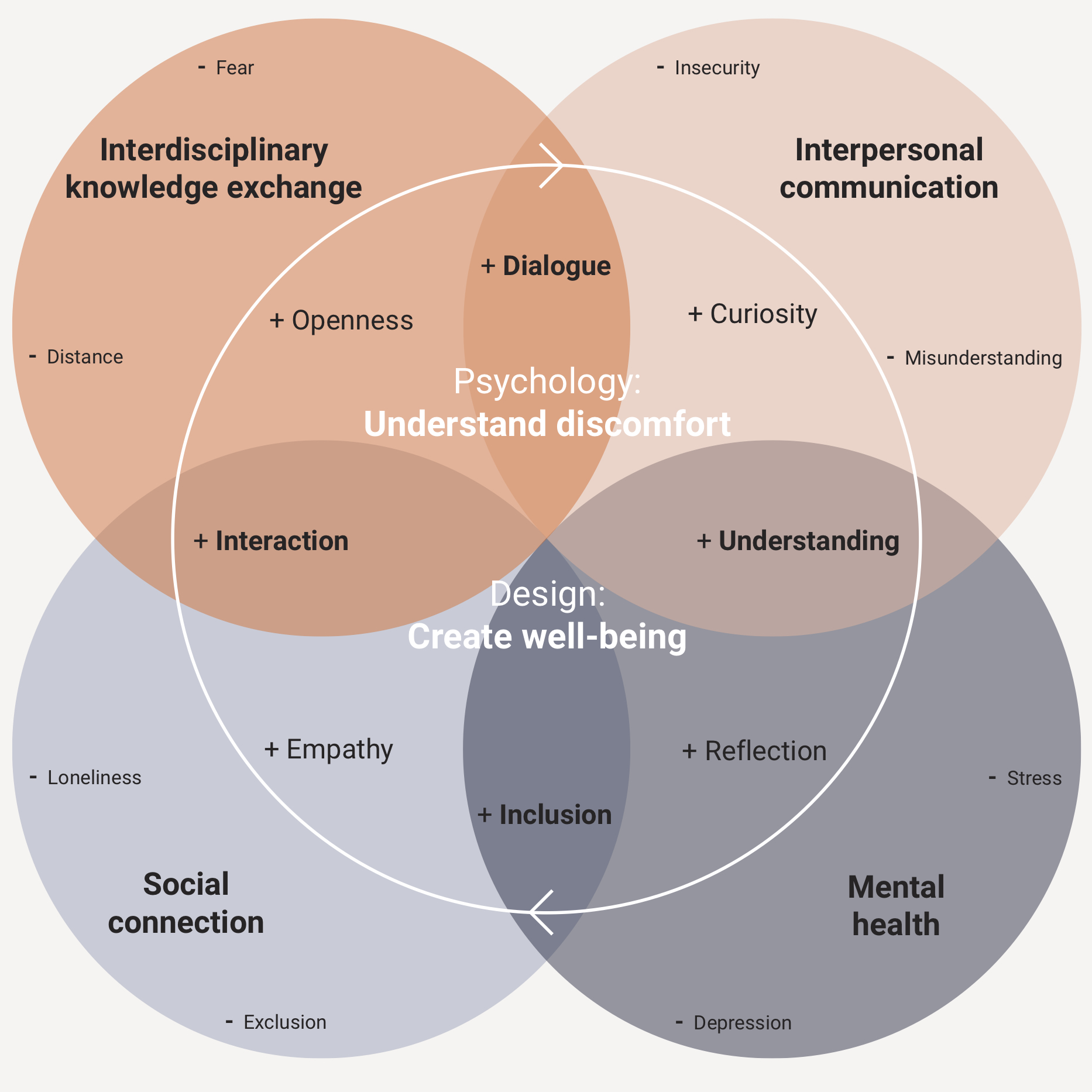 The Venn diagram illustrates my model: overlapping circles represent knowledge exchange, communication, connection, and mental health. At their intersection lies the central focus: reducing discomfort and increasing comfort. Elements outside the circles are minimised, while elements within are maximised.